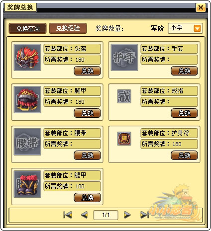 兑换套装 套装兑换根据不同的竞技场军阶所兑换到的套装是不同的。 1、小学军阶可兑换套装需求等级为21级,兑换部位为头盔、胸甲、腿甲、护身符。 2、初中军阶可兑换套装需求等级为31级,兑换部位为头盔、胸甲、腿甲、护身符。 3、高中军阶可兑换套装需求等级为41级,兑换部位为头盔、胸甲、腿甲、护身符。