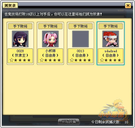 玩家在竞技场中击败的对手等级18级以上就会显示在玩家的抓捕列表中,玩家可对其进行抓捕,对方身份为的不同抓捕后获得的奴隶将是不同的。