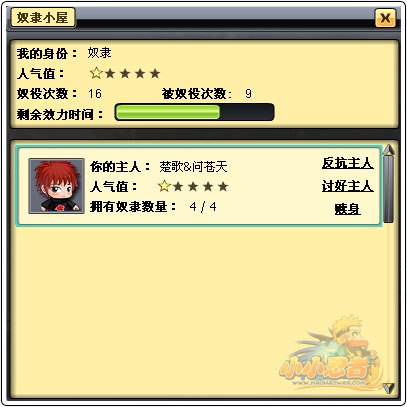 奴隶与奴隶主之间通过互动双方都可获得经验值作为回报奖励。