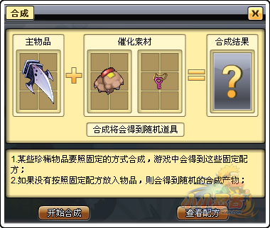合成物类型 随机合成中,合成物品类型与主物品类型相同。即若是主物品放入某类型的道具,则不管催化材料中放入任何物品,最终合成结果的物品类型一定和主物品相同。所以,在明确合成目标后,请放入和合成目标同一类型的物品在主物品中。