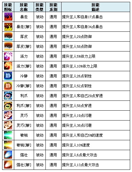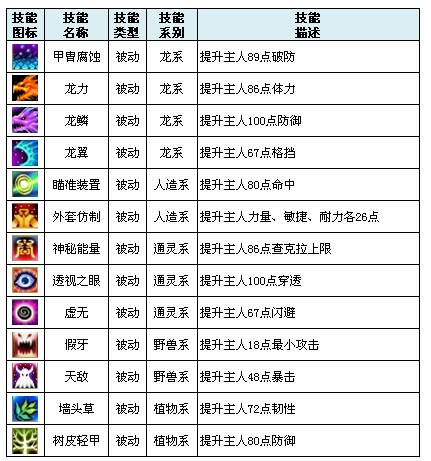 被动技能:被动技能可以为主人的各种属性起到加成效果,不同系别的宠物会有自己类系的特有被动技能效果。选择最适合自己的被动技能,让自己的属性数值更加强大!