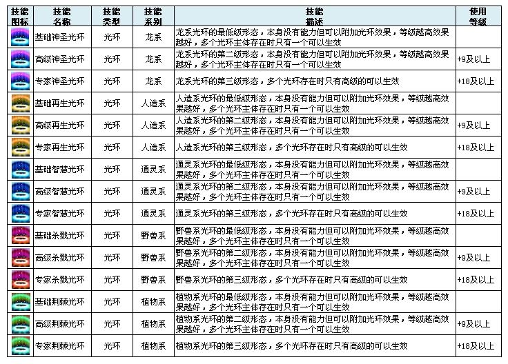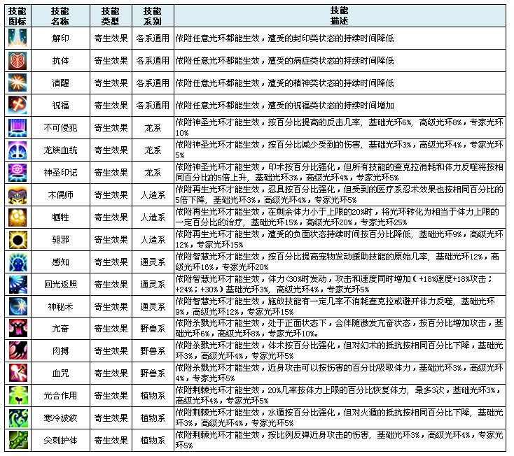 光环技能:光环技能是启动寄生效果技能的基础,主光环等级越高寄生效果技能越明显。寄生效果技能能帮助主人在战斗更持久,威力更强大!不同系别的宠物光环拥有独有光环效果。