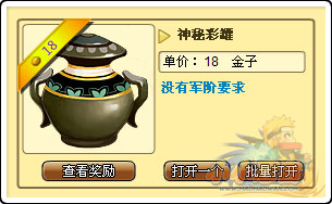 “神秘彩罐”中的奖励比使用奖牌的罐子奖励更为丰厚,有非常高的几率开出游戏内比较稀有的外套以及各类石头。同时,每次开启彩罐,需要消耗一定数量的金子。对于身上没有足够的奖牌,但是希望享受砸罐子来带的乐趣,可以使用“神秘彩罐”。