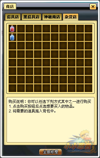 目前杂货店只出售两类道具: 小疗伤药水:使用后可以恢复150点体力 小益气药水:使用后可以恢复90点查克拉