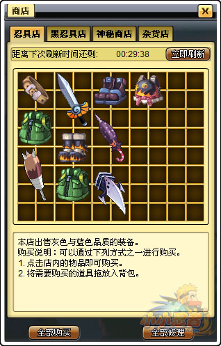 忍具店出售灰色与蓝色品质的装备,装备属性已经鉴定,需要使用石子进行购买。可以通过各大城市进入商店建筑选择“忍具店”进入。
