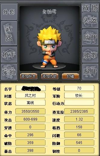 鸣人初始S:力:28 敏:24 耐:24 ,转化成长:力:1.4/12 敏:1.2/15 耐: 1.2/12由成长数据可见,主攻次血.鸣人的攻是所有角色中成长最快最高的,每12点就加成1.4%.这也铁定了在小小里唯一的狂战士.所选属性有加攻和力量就可以了,其次就是血量.,由外套数据可得,鸣人是高攻中血的中速流.要求:高破防中命中.有人话为什么不高爆,原因简单,速度不像我爱罗,出手次数不会少,确保每次有稳定的高伤害就够了,高攻+高破防够对手受的.总结鸣人正确属性加成:主动加成首攻次耐.敏适量就可,辅助加成:首破防次命.